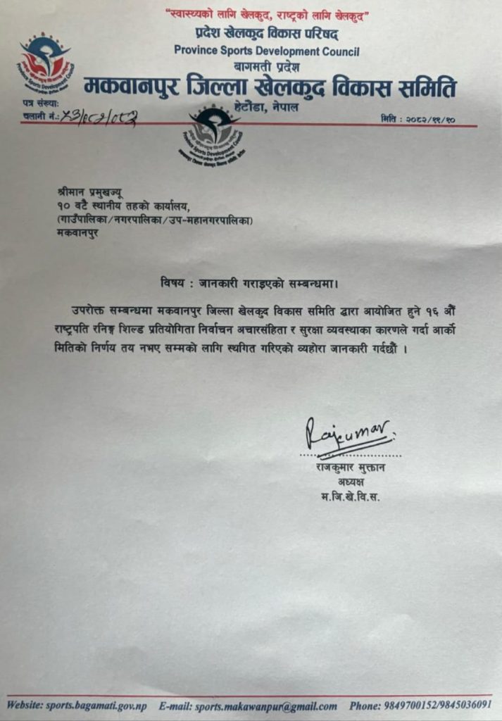 हेटौंडा । मकवानपुर जिल्ला खेलकुद विकास समितिको आयोजनामा भोलिबाट सुरु हुन लागेको १६ औं जिल्लास्तरीय राष्ट्रपति रनिङ्ग शिल्ड प्रतियोगिता स्थगित भएको छ । आइतबार खेलकुदका अध्यक्ष राजकुमार मोक्तानले एक सूचना जारी गर्दै निर्वाचन अचारसंहिता र सुरक्षा व्यवस्थाका कारणले गर्दा आर्को मितिको निर्णय तय नभए सम्मको लागि प्रतियोगिता स्थगित गरिएको जानकारी गराएका छन् ।