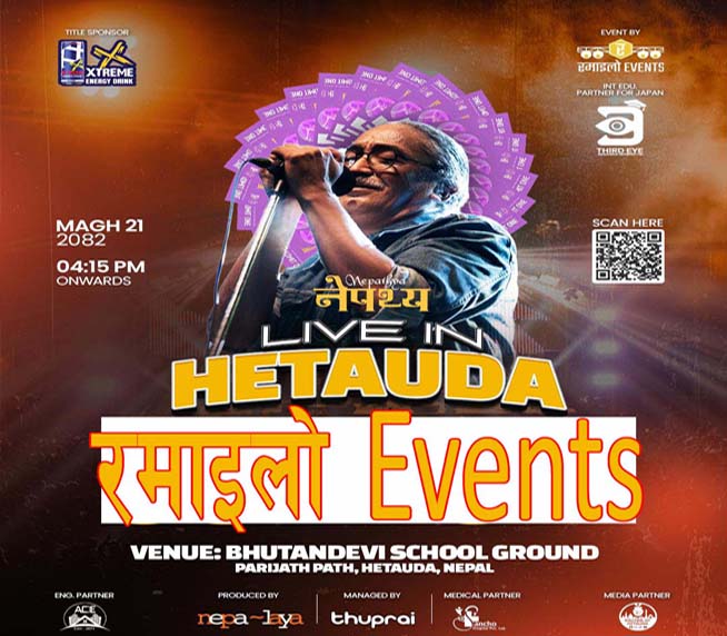 रोशन दिप – हेटौँडा–४ स्थित भुटनदेवी माविको मैदानमा बुधबार चर्चित लोक रक ब्यान्ड ‘नेपथ्य’ को कन्सर्ट हुने भएको छ । माघ २१ गते रमाइलो इभेन्टस् हेटौँडाको आयोजनामा नेपथ्यले लाइभ कन्सर्ट गर्न लागेको हो ।