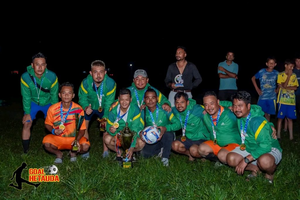 हेटौंडा । हेटौंडा–७,नागस्वतीस्थित नवज्योति माध्यमिक विद्यालयको खेलमैदानमा भएको पहिलो अन्तर क्लबस्तरीय फुटबल प्रतियोगिताको उपाधि आयोजक नागस्वती युथ क्लबले जितेको छ । शनिबार भएको फाइनल खेलमा आयोजक नागस्वती युथ क्लबले नागस्वती भेट्रान्स क्लबलाई २–० गोलले हराउँदै उपाधि चुम्न सफल भएको हो । प्रतियोगिताको उपाधि जितेसँगै नागस्वती युथ क्लबको टिमले एकलाख रुपैयाँसहित शिल्ड, मेडल तथा प्रमाणपत्र प्राप्त गरेका छन् भने उपविजेता टिम नागस्वती भेट्रान्सको टिमले ५० हजार रुपैयाँसहित शिल्ड, मेडल तथा प्रमाणपत्र प्राप्त गरेका छन् । नागस्वती युथ क्लबको तर्फबाट पहिलो हाफमा राजेन्द्रै थापाले एक गोल गरेका थिए ।