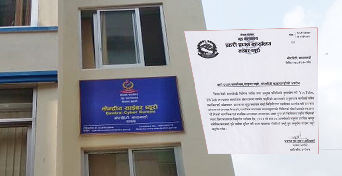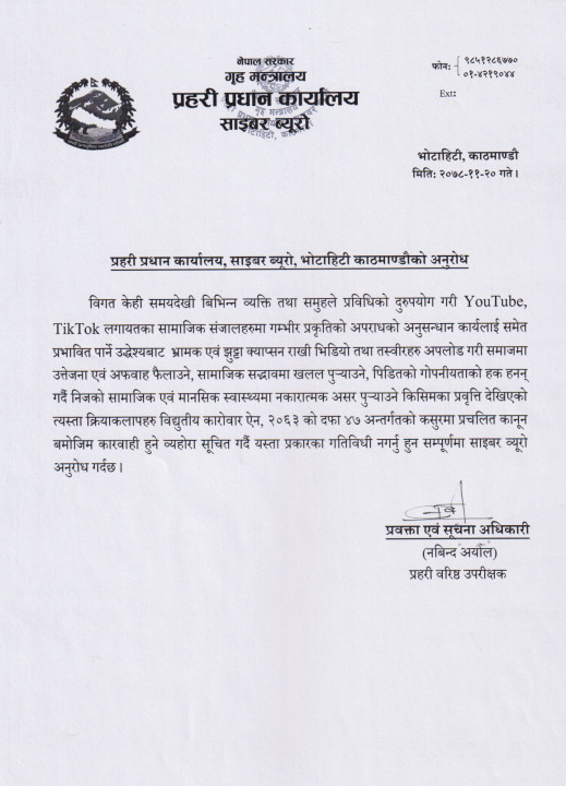 विगत केही समयदेखी बिभिन्न व्यक्ति तथा समुहले प्रविधिको दुरुपयोग गरी YouTube, TikTok लगायतका सामाजिक संजालहरुमा गम्भीर प्रकृतिको अपराधको अनुसन्धान कार्यलाई समेत प्रभावित पार्ने उद्धेश्यबाट भ्रामक एवं झुट्टा क्याप्सन राखी भिडियो तथा तस्वीरहरु अपलोड गरी समाजमा उत्तेजना एवं अफवाह फैलाउने, सामाजिक सद्भावमा खलल पुऱ्याउने, पिडितको गोपनीयताको हक हनन् गर्दै निजको सामाजिक एवं मानसिक स्वास्थ्यमा नकारात्मक असर पुऱ्याउने किसिमका प्रवृत्ति देखिएको त्यस्ता क्रियाकलापहरु विद्युतीय कारोवार ऐन, २०६३ को दफा ४७ अन्तर्गतको कसुरमा प्रचलित कानून बमोजिम कारवाही हुने व्यहोरा सूचित गर्दै यस्ता प्रकारका गतिविधी नगर्नु हुन सम्पूर्णमा साइबर व्यूरो अनुरोध गर्दछ।