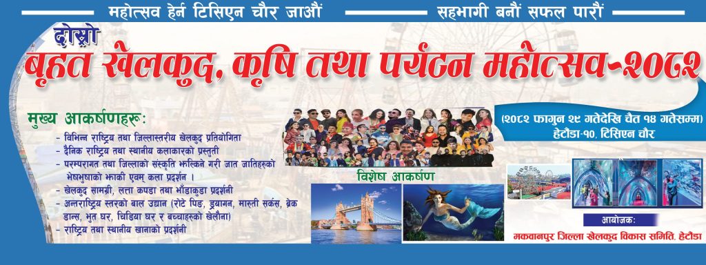 हेटौंडा । हेटौंडा–१०,स्थित टिसिएन चौरमा यही शुक्रबारबाट सुरु हुन लागेको दोस्रो खेलकुद, कृषि तथा पर्यटन महोत्वसको तयारी अन्तिम चरणमा पुगेको छ । मकवानपुर जिल्ला खेलकुद विकास समितिको अयोजनामा हुन लागेको खेलकुद, कृषि तथा पर्यटन महोत्सवको लागि आवश्यक तयारी पुरा गर्न लागिएको आयोजकले जनाएको छ ।गत भदौ महिना भएको जेनजी आन्दोलनको क्रममा जिल्ला खेलकुद विकास समिति मकवानपुरको भवनमा भौतिक क्षति पुगेको थियो ।