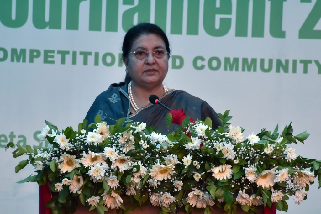 रोयल नेपाल गल्फमा आज आयोजित खुला महिला गल्फ प्रतियोगिताको विजेता खेलाडीहरूलाई पुरस्कार प्रदान गर्दै राष्ट्रपति भण्डारीले भन्नुभयो, “हाम्रो देशको भौगोलिक बनोट अनुकूल मौसम भएकाले गल्फ खेलको विकासको ठूलो सम्भावना छ, त्यसैले यस खेलको प्रवद्र्धनबाट अन्तर्राष्ट्रिय खेलाडीलाई आर्कषक गरी खेल पर्यटनको विकास गर्न सहज हुनेछ ।” उहाँले खेलकुदको विकासका लागि सरकारी तथा निजी क्षेत्रसम्बद्ध सबैले खेलक्षेत्रमा लगानी गर्न पर्याप्त ध्यान दिनुपर्नेमा जोड दिनुभयो ।