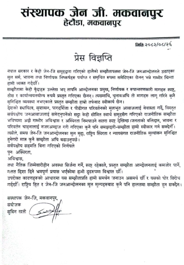 हेटौंडा । जेनजी मकवानपुरले नेपाल सरकार तथा केही जेन–जी समूहबीच हाल भइरहेका सहमतिको प्रक्रियाप्रति गम्भीर आपत्ति जनाएको छ। समूहका संयोजक सुविन खत्रीले जारी गरेको प्रेस विज्ञप्तिमा हालका सहमतिकार्यहरू जनआन्दोलनका मूल भावना, मान्यता तथा निर्णयकारी निकायको प्रक्रियासँग मेल नखाने उल्लेख गरिएको छ ।