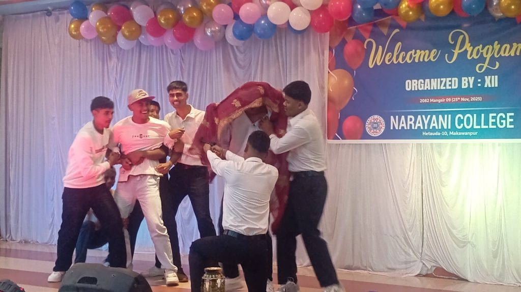 हेटौंडा । हेटौंडा-१०,स्थित नारायणी कलेजमा कक्षा-११ अध्यनरत विद्यार्थीलाई स्वागत गरिएको छ । मङ्गबार कलेजका कक्षा-१२ मा अध्यनरत विद्यार्थीले कक्षा-११ मा नयाँ भर्ना भएर आएका विद्यार्थीका लागि स्वागत कार्यक्रमको आयोजना गरेको हो ।