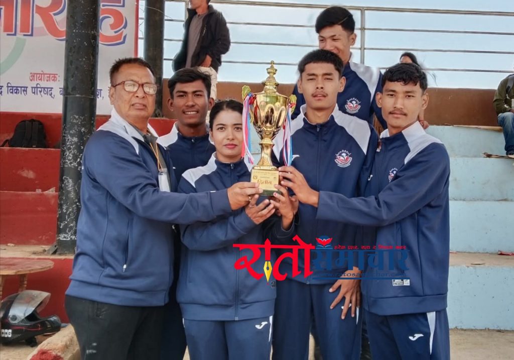 द्वितीय भएर ट्रफी ग्रहण गरेपछिक मकवानपुरका खेलाडीहरु सामूहिक तस्बीर खिचाउँदै ।