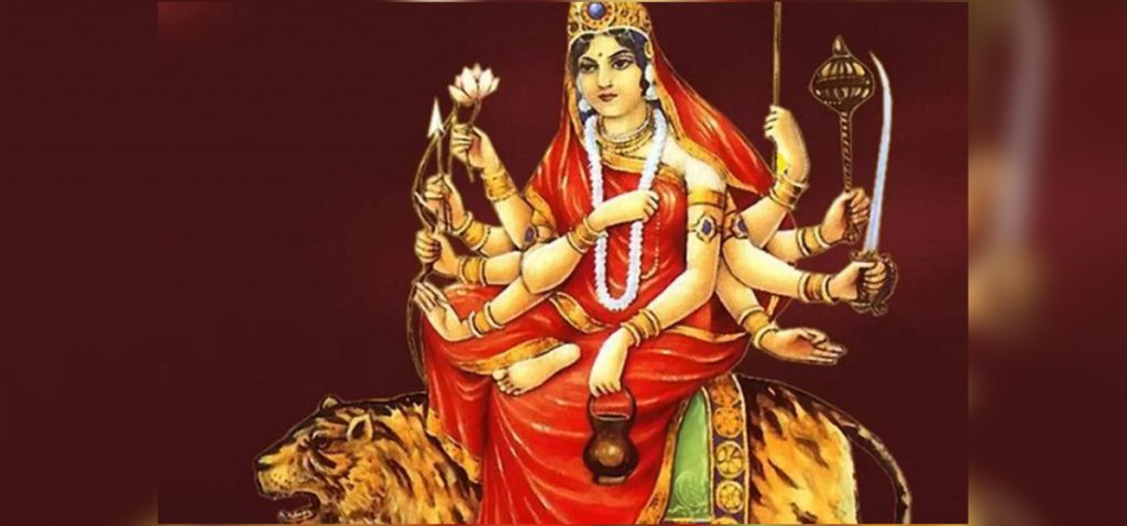 मार्कण्डेय पुराणमा ‘चन्द्रः घण्टायां यस्याः सा’ अर्थात् चन्द्रमा जसको घण्टामा रहेको छ उहाँको नाम चन्द्रघण्टा हो भनी उल्लेख गरिएको छ। चन्द्रघण्टा देवीले शिरमा अर्धचन्द्रका साथै घण्ट पनि धारणा गर्ने भएकाले यो नाम रहन गएको हो। चन्द्रघण्टा देवीको स्वरुप पहेँलो वर्णको हुन्छ। यस्ती देवीले अत्याचारी दानवी स्वरुपलाई नाश गर्नुहुन्छ। चन्द्रघण्टा देवीको पूजा आराधनाका दिन मणिपुर चक्रलाई ध्यान गरिन्छ। चन्द्रघण्टा देवीको स्वरुपको ध्यान गर्दा अनेकौँ शक्ति प्राप्त हुने विश्वास गरिन्छ।