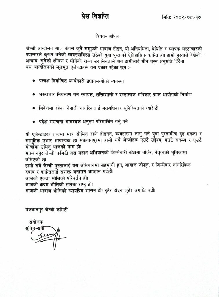 रोशन दिप – मकवानपुरको जेन–जी समितिले बुधवार विज्ञप्ति जारी गर्दै मकवानपुरका सबै जेन–जी एक हुन आह्वान
