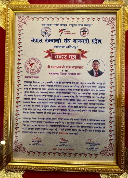 मकवानपुर जिल्ला तेक्वान्दो संघका अध्यक्ष पदमा आशिन रहि खेलको विकास र व्यवस्थापनमा समेत तपाईको निरन्तर योगदान र लगनशिलता सरानीय छ । एक कर्मठ, लगनशिल र जागरुक तेक्वान्दो कमी एवं युवा पिडिका प्रेरणाका स्रोत तपाईलाई नेपाल तेक्वान्दो संघ बागमती प्रदेशको तर्फबाट सम्मानित गर्न पाउँदा हामीहरु अत्यन्तै प्रफुल्लित भएका छौ साथै आगामी दिनमा पनि यसरीनै खेल र खेलकुद प्रति तपाईको सदैव साथ र सहयोग रहनेछ भन्दै यो कदर पत्र प्रदान गर्दछौं ।