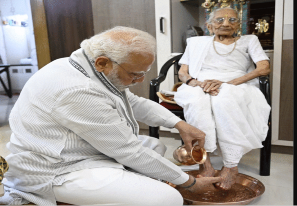 भारतका प्रधानमन्त्री नरेन्द्र मोदीले आफ्नी आमाको खुट्टा धोएर आशीर्वाद लिएका छन् । प्रधानमन्त्री मोदीकी माता हीराबेन मोदीको आज १०० औँ जन्मदिन हो । प्रधानमन्त्रीले आफ्नी आमालाई आज बिहान यहाँस्थित निवासमा भेटेर आशीर्वाद लिएका हुन् । “आज १०० वर्षमा प्रवेश गर्नुभएकी मेरी आमाबाट आशीर्वाद लिएँ,”उनले आज बिहानै ट्विट गर्दै भनेका छन् । तीन महिनाअघि उनले आफ्नी आमालाई भेटेका थिए । हीराबेन मोदीको जन्म शतवार्षिकीका अवसरमा आजै गान्धीनगरको एउटा सडकलाई अब हीराबेन मोदी मार्ग नामकरण गरिने नगरप्रमुख हितेश मवानले बताएका छन् । हीराबेन मोदीबाट भावी पुस्ताले त्याग, तपस्या, सदाचार र सेवाको पाठ सिकुन् भन्ने उद्देश्यले सडकको नाम हीराबेन मोदी राखिएको जनाउँदै गान्धीनगर नगरका प्रमुखले प्रधानमन्त्रीकी माताको नाम जीवित राख्न पनि त्यसो गरिएको स्पष्ट गरे । आमाबाट आशीर्वाद लिएर प्रधानमन्त्री मोदी पञ्चमहल जिल्लाको प्रसिद्ध तीर्थस्थल पावगढको भ्रमण गर्ने कार्यक्रम रहेको गुजरात सूचना विभागले जारी गरेको विज्ञप्तिमा जनाइएको छ ।रासस
