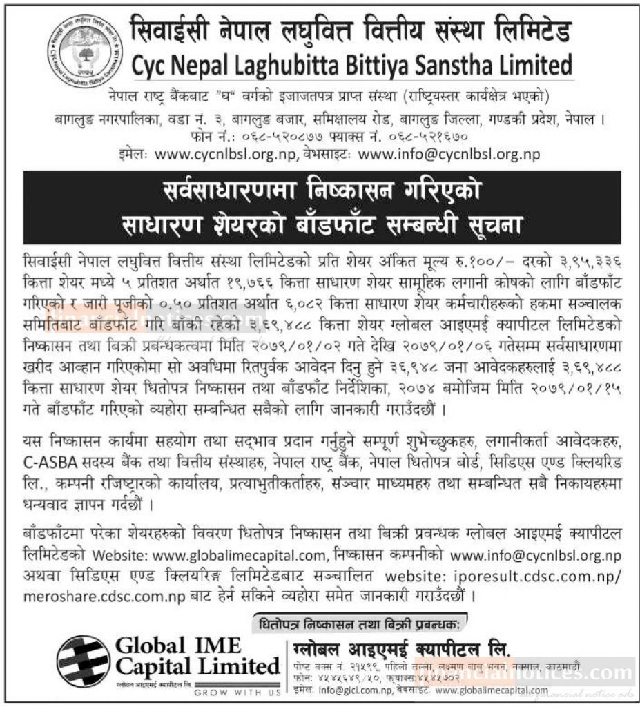 कम्पनीले जारी पूँजी रु एक अर्ब ५९ करोड ३० लाखको १५ प्रतिशतले हुने प्रतिशेयर १०० अङ्कित मूल्यका २३ लाख ८९ हजार ५०० कित्ता साधारण शेयर निष्कासन गर्न लागेको हो । सार्वजनिक आह्वान पत्रानुसार निष्कासित शेयरमध्ये पाँच प्रतिशत अर्थात् एक लाख १९ हजार ४७५ कित्ता शेयर सामूहिक लगानी कोषलाई बाँडफाँट गरी बाँकी रहने २२ लाख ७० हजार २५ कित्ता शेयरमा सर्वसाधारण लगानीकर्ताले आवेदन दिन सक्ने छन् ।