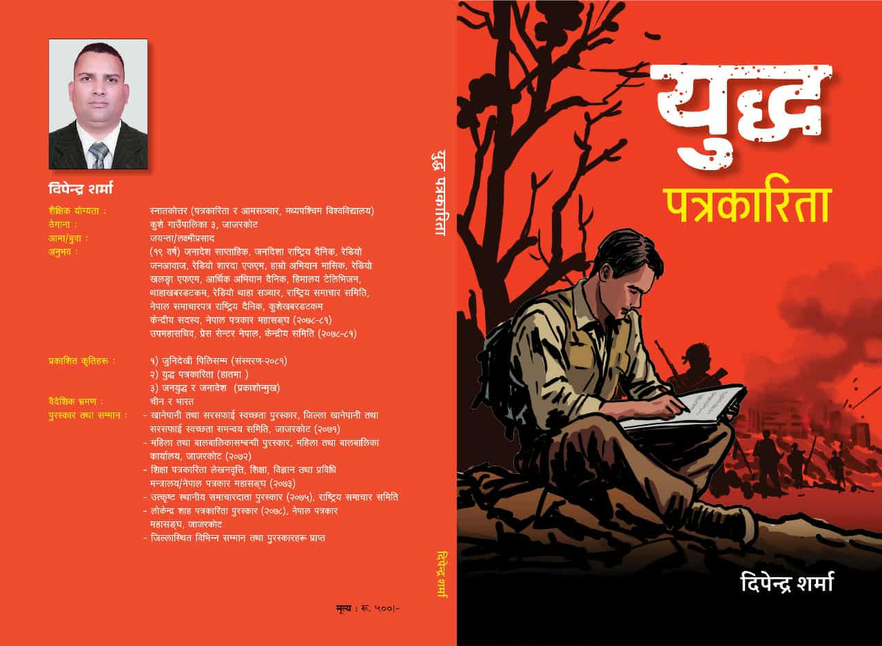 हेटौंडा । संघर्षका सात अध्याय बोकेको जाजरकोटका पत्रकार दीपेन्द्र शर्माको कृति युद्ध पत्रकारिता पुस्तकको काठमाडौंमा लोकार्पण” गरिएको छ । शुक्रबार काठमाडौंको आनामनगरस्थित संवाद डबलीमा एक समारोहकाबीच  पत्रकार दीपेन्द्र शर्माको ७ अध्याय बोकेको कृति युद्ध पत्रकारिता पुस्तकको लोकापर्ण गरिएको हो । यस अघि शर्माको पहिलो पुस्तक युद्ध, शान्ति र पत्रकारिताको जीवन्त अनुभूति ‘जुनिदेखि पिलिसम्म’ गत वर्ष सार्वजानिक भएको थियो । गत वर्षको भदौमा तत्कालिन प्रधानमन्त्री एवम नेपाली कम्युनिष्ट पार्टी (नेकपा)का केन्द्रीय अध्यक्ष पुष्पकमल दाहाल ‘प्रचण्ड’ले उक्त पुस्तकलाई लोकापर्ण गरेका थिए । पत्रकार शर्मा प्रेस सेन्टर नेपालका पूर्व उपमहासचिव एवम् नेपाल पत्रकार महासंघका पूर्व केन्द्रीय सदस्य हुन् ।