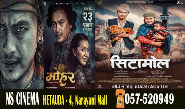 रोशन दिप – हेटौडा – ४ नारायणी मलमा रहेको एनएस सिनेमा हलमा गते शुक्रबार देखि पल शाह स्टारर नेपाली फिल्म मोहर र सौगात मल्ल स्टारर फिल्म सिटामोल रिलिज हुँदै छ ।