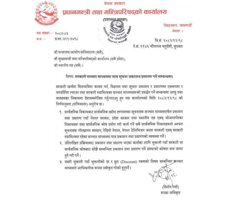 सरकारी खर्चमा मितव्ययिता कायम गर्न, विज्ञापन तथा सूचना प्रकाशन र प्रसारणमा एकरूपता र पारदर्शिता ल्याउन तथा सरकारी स्वामित्वका सञ्चार माध्यमहरूको प्रवद्र्धन गर्न बुधबारबाट यस्तो निर्णय गरेको जानकारी गराइएको छ ।