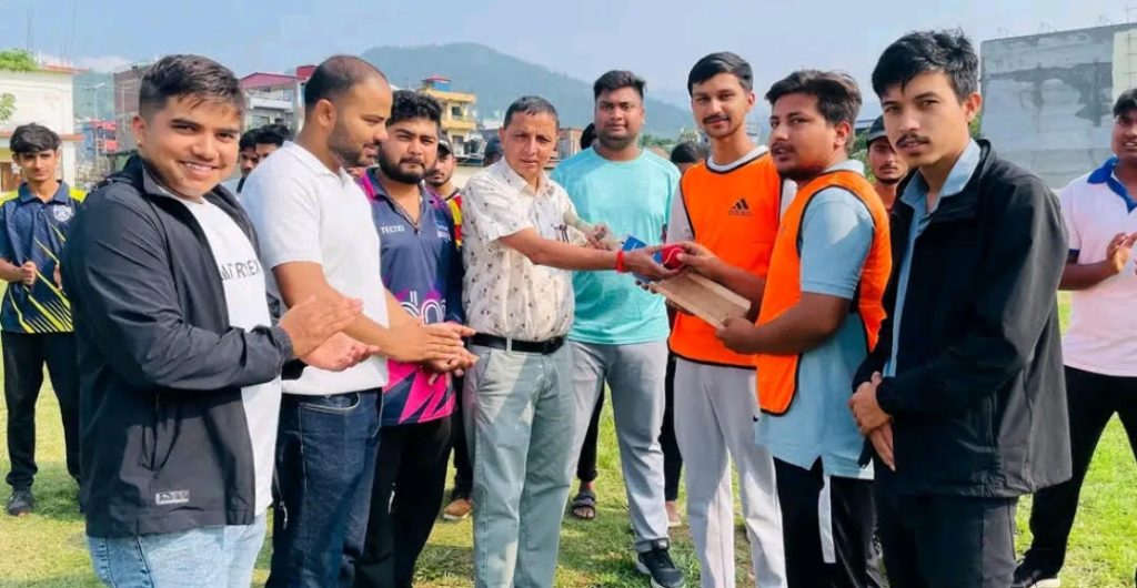 क्रिकेट व्याट र बल हस्तान्तरण गरेर प्रतियोगिताको उद्घाटन गर्दै वडाध्यक्ष नवीन सिग्देल ।