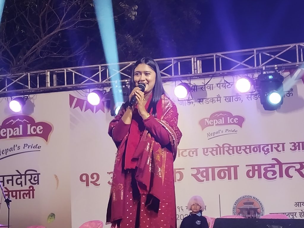 हेटौंडा । गायिक रचना रिमालले हेटौंडामा आफ्नो सांगितीक प्रस्तुती दिएकी छिन् । होटल एशोसिएसन मकवानपुरको आयोजनामा आइतबारबाट हेटौंडामा सुरु भएको १२ औं सडक खाना महोत्सवको पहिलो दिन गायिक रचना रिमालले आफ्नो सांगीतिक प्रस्तुती दिएकी हुन् ।