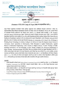 बागमती प्रदेशको राजधानी हेटौडामा रहेको एस्ट्रोनोभा फाउण्डेले नेपालले वैशाख ९ गतेदेखि ‘समर स्टिम क्याम्प तथा एक्स्पो–२०८३’आयोजना गर्दै १५० जना विद्यार्थीलाई पूर्ण छात्रवृत्ति प्रदान गर्ने भएको छ।