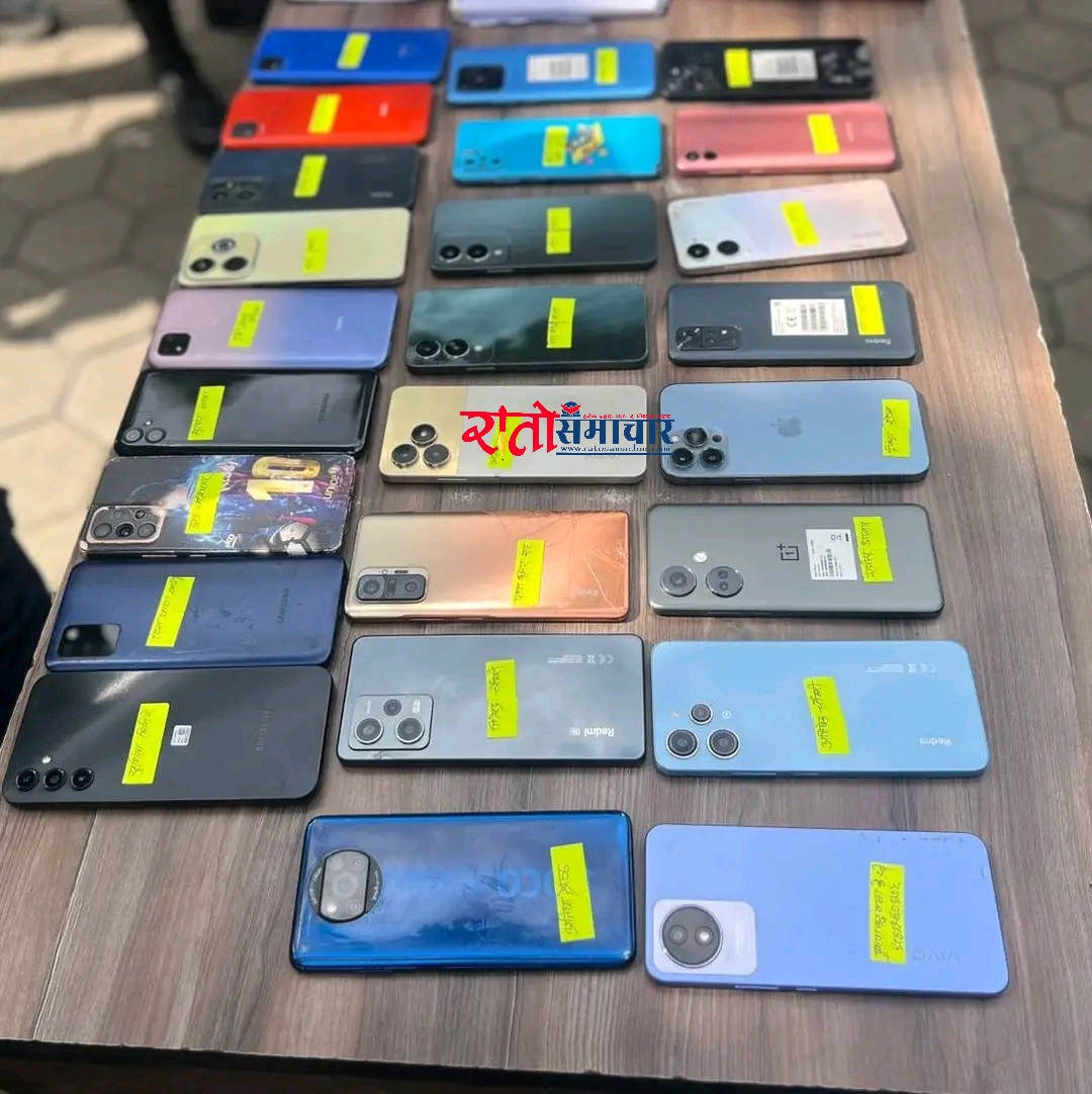 चितवन प्रहरीले हराएर फेला पारेको मोबाइललाई सार्वजानिक गरिँदाको तस्बीर ।