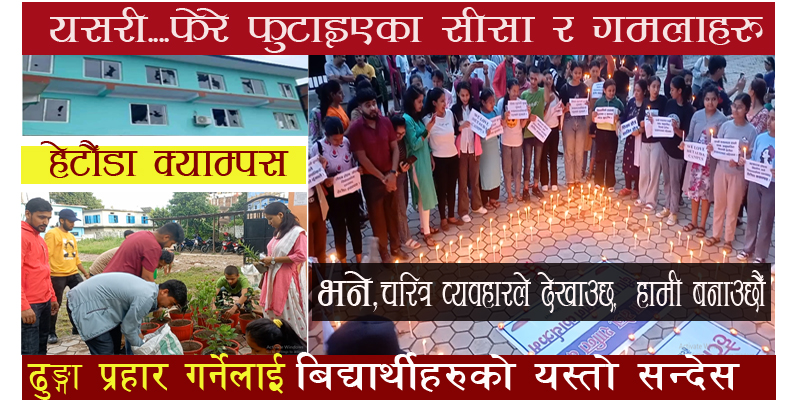 बिएड तेस्रे र चौथौ वर्षमा अध्यनरत बिद्यार्थीहरुले आफ्नै पहलमा करिब ८० हजार रुपैयाँ संकलन गरी क्षतिग्रस्त भएक झ्यालहरुका सिसा, गमलाहरु फेरेर यस्तो बताएका हुन् । तोड्न होइन जोड्न सिकाएकोमा धन्यवाद हेटौंडा क्याम्पस लगायतका बिभिन्न सन्देशमुलक व्यानर सहित बिद्यार्थीहरु शुक्रबार साँझ दीप प्रज्ज्वलन समेत गरेका छन्।