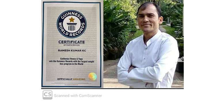 सर्लाही जिल्लाका ईश्वरपुर नगरपालिका स्थायी घर भएका के.सी.ले क्यालिफोर्निया फिटनेस र योगले आयोजना गरेको सवैभन्दा धेरै मानिस सहभागी भएको लार्जेस्ट वेट लस प्रोग्राममा सहभागी भए बापत छनौट भइ अनलाईन गिनिज वल्र्ड रेकर्डसले सम्मान गरेको हो ।