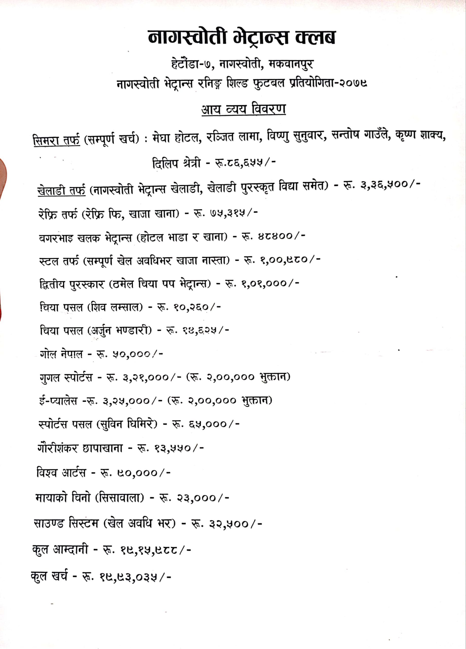 हेटौडा उप-महानगरपालिका स्थित ७ नागस्वती खेल मैदानमा सम्पन्न भएको नागस्वती भेट्रान्स रनिङ शिल्ड एट ए साइड फुटबल प्रतियोगिताको आय व्यय सार्वजनिक गरीएको छ ।