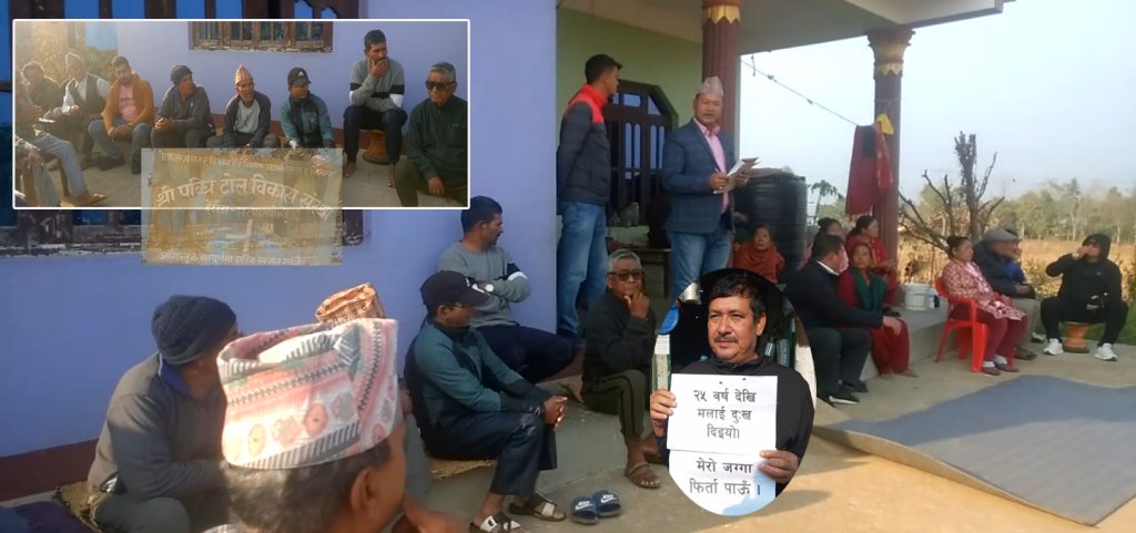 हेटौंडाको बुद्धचोक नजिकै कालो व्यानर सहित ११ कठ्ठा १६ धुर जग्गा फिर्ताको माग गर्दै गएको कार्तिक 27गते देखि धर्ना दिएर अपिल गरीरिहेका हुन् ।