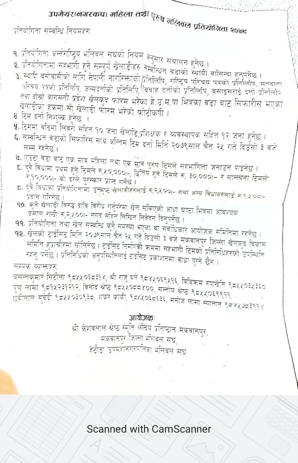 ११. प्रतियोगिता तथा खेल सम्बन्धि कुनै समस्या भएका वा सर्वाधिकार आयोजक समितिमा रहनेछ ।