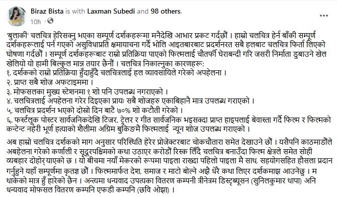 ‘बुलाकी’ चलचित्र हेरिसक्नु भएका सम्पूर्ण दर्शकहरूमा मनैदेखि आभार प्रकट गर्दछौं । हाम्रो चलचित्र हेर्न बाँकी सम्पूर्ण दर्शकहरूलाई पर्न गएको असुविधाप्रति क्षमायाचना गर्दै भोलि आइतबारबाट प्रदर्शनरत सबै हलबाट चलचित्र फिर्ता लिएको घोषणा गर्दछौं । सम्पूर्ण दर्शकहरूबाट राम्रो प्रतिक्रिया पाएको फिल्मलाई चौतर्फी घेराबन्दी गरि जसरी निर्माता डुबाउने खेल खेलियो यो हामी बिल्कुल मान्न तयार छैनौं । चलचित्र निकाल्नुका कारणहरू: