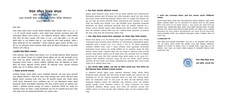 गएको आश्विन ५ र १२ गते सरकारसंग भएको त्रुटीपूर्ण संझौता लगायतको का विषयमाकेन्द्रित भन्दै शिक्षक संगठनका ६० जिल्ला अध्यक्षहरुले हस्ताक्षर गरी समीक्षा गर्न माग गरिएको र संगठन राष्ट्रिय समितिको भेलालाई समेटेको भनिएको छ ।