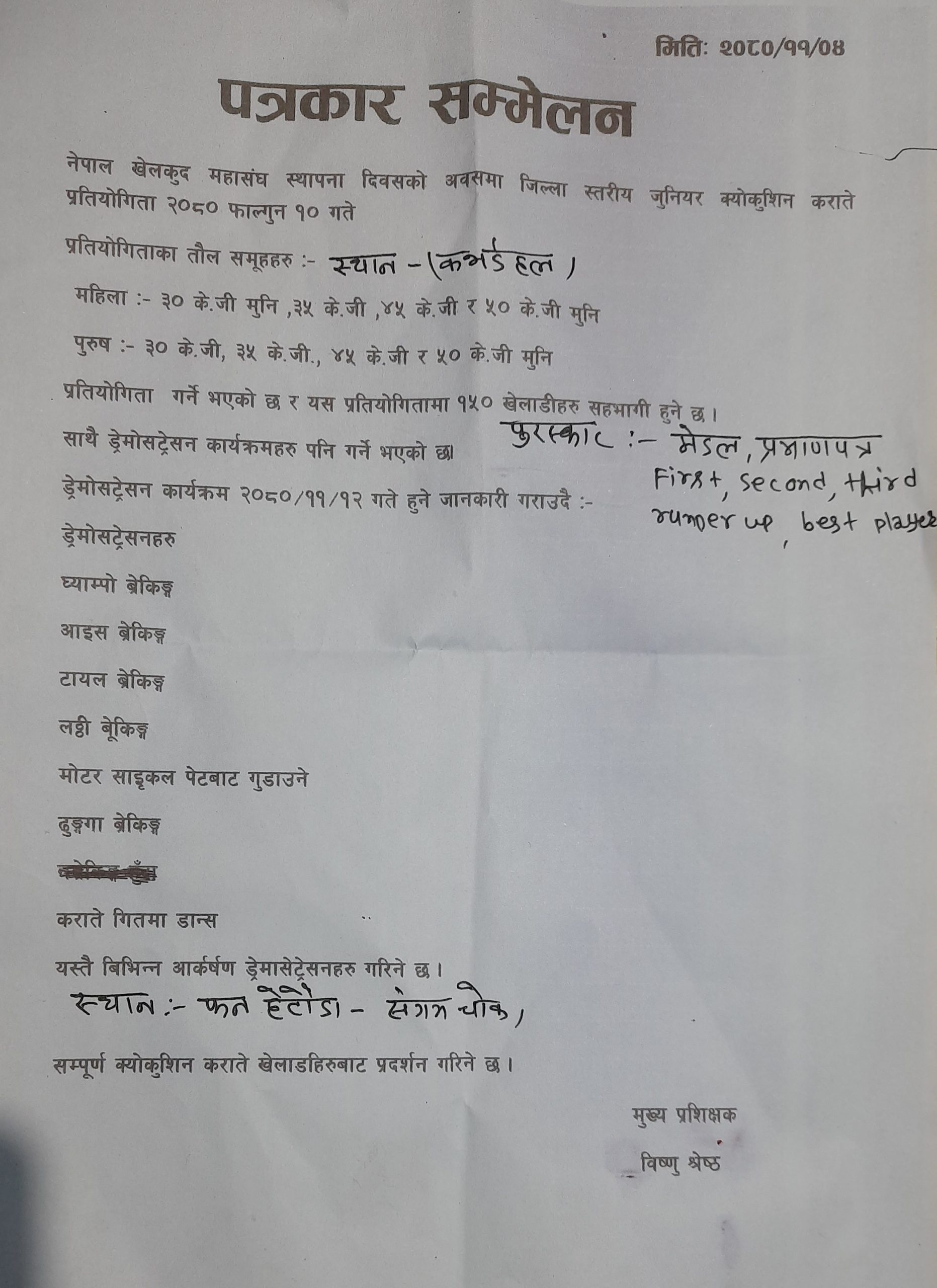 नेपाल खेलकुद महासंघले स्थापना दिवसको अवसरमा जुनियर क्योकोशीन जिल्ला स्तरीय कराते प्रतियोगिता तथा नगर सम्मेलन