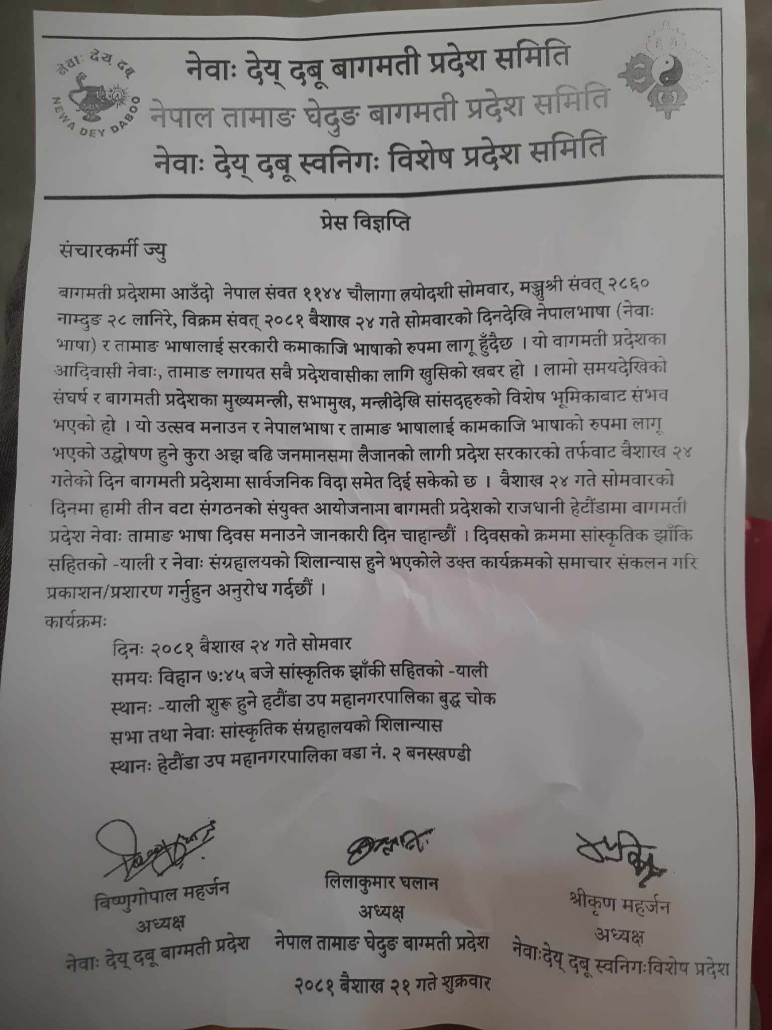 शुक्रबार नेवाः देय् दबू बाग्मती प्रदेश, नेपाल तामाङ घेदुङ बाग्मती प्रदेश नेवाः देय् दबू स्वनिगः विशेष प्रदेशले पत्रकार सम्मेलनको आयोृजना गर्दै तीन वटा संगठनको संयुक्त आयोजनामा बागमती प्रदेशको राजधानी हेटौंडामा बागमती प्रदेश नेवाः तामाङ भाषा दिवस मनाउने जानकारी गराइएको छ ।