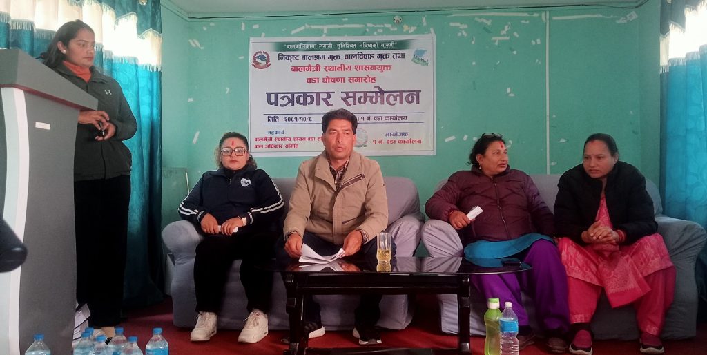 ‘बालबालिकामा लगानी शुनिश्चित भविष्यको थालनी’ भन्ने मुल नाराका साथ माघ ११ गते शुक्रबारबालमैत्री वडा घोषणा गर्न लागेको पत्रकार सम्मेलन मार्फत जानकारी गराइएको हो ।