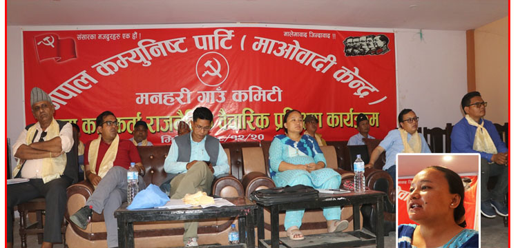 माओवादी केन्द्र मनहरी गाउँपालिका चुनाबी कमाण्डर वीर बहादुर घलान “ज्वाला” को सभाध्यक्षता पार्टीको केन्द्रिय सदस्य तथा मकवानपुर इन्चार्ज कुमारी मोक्तानको प्रमुख आतिथ्यतामा सम्पन्न कार्यक्रममा बोल्दै जनताको सहि पार्टी माओवादी नै भएको माओवादी केन्द्र बागमती प्रदेशका उपाध्यक्ष प्रेम बहादुर पुलामी “छिन्तु” ले बताएका छन् ।