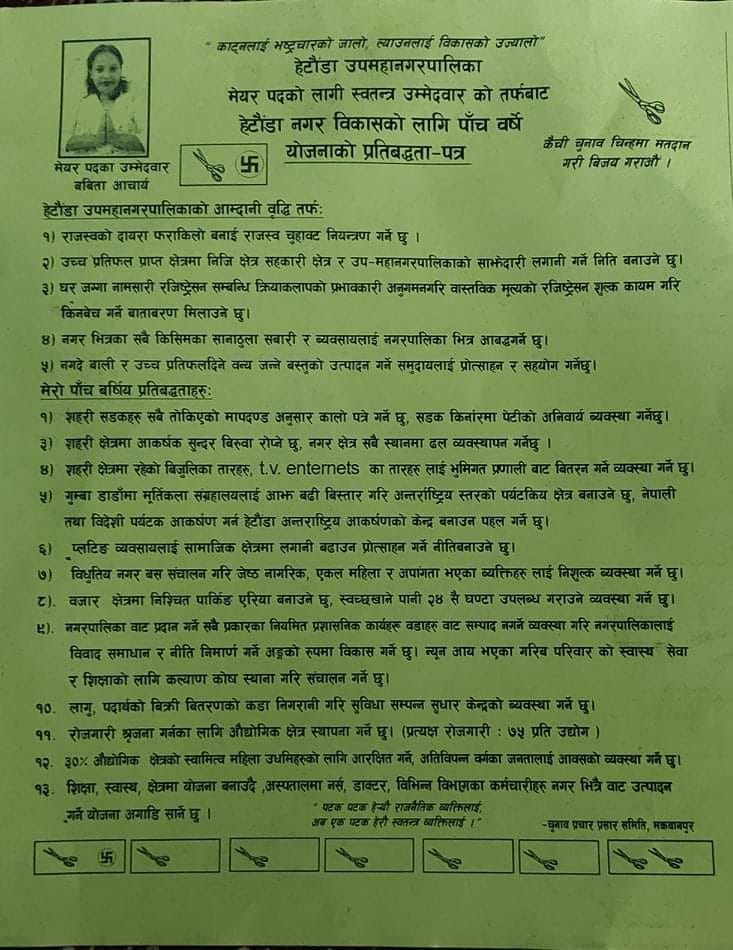 हेटौँडा उपमहानगरपालिका वडा नंबर १९ कि स्थायी वासिन्दा तथा युवा ब्यवसायी समेत रहेकि बबिताले चुनाव चिन्हमा कैँची’ पाएपछि आफ्नो योजना सहितको घोषण पत्र सार्वजनिक गरेकी छन् ।