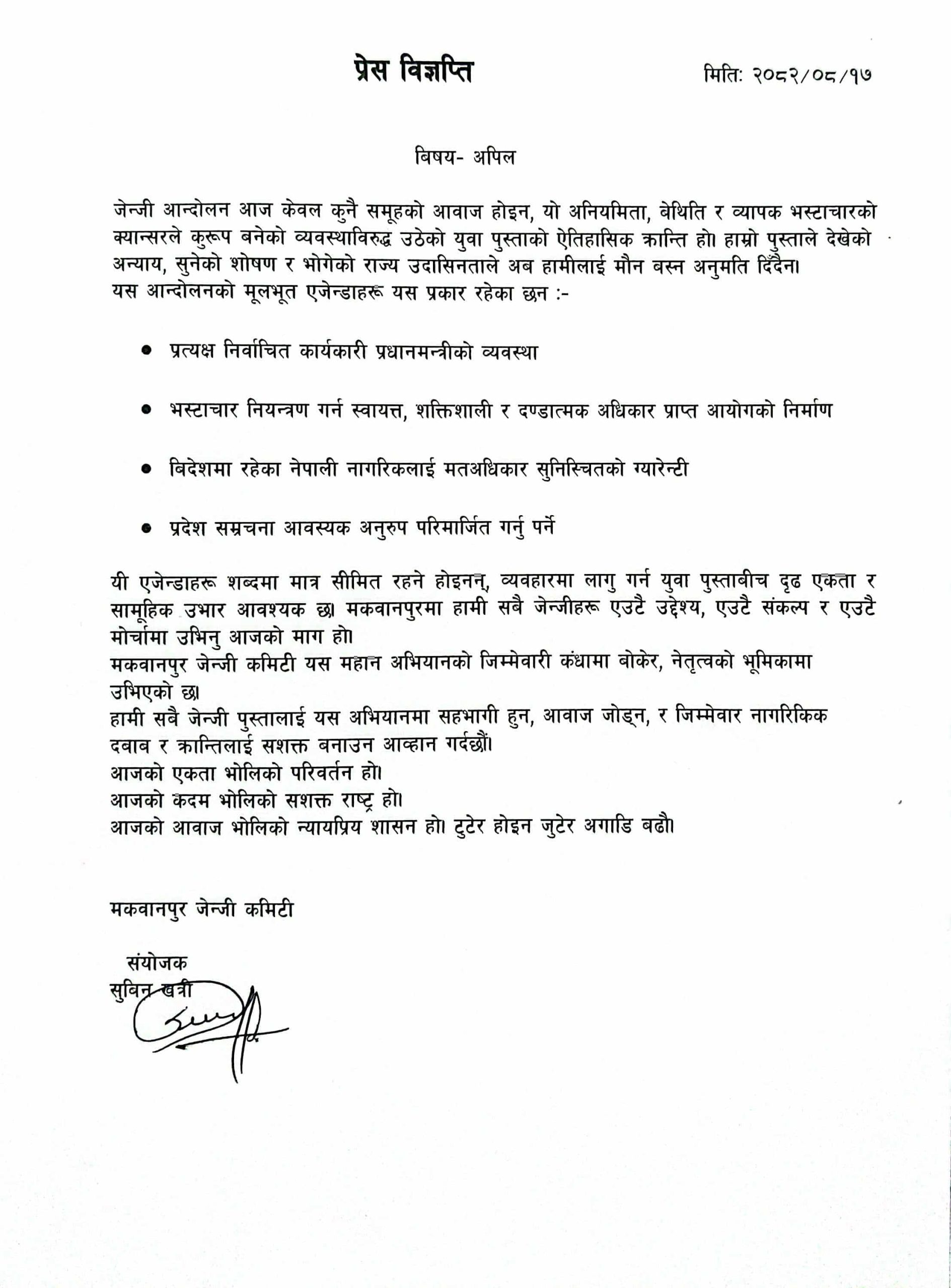 मकवानपुरका सबै जेन–जीलाई एक हुन आह्वान