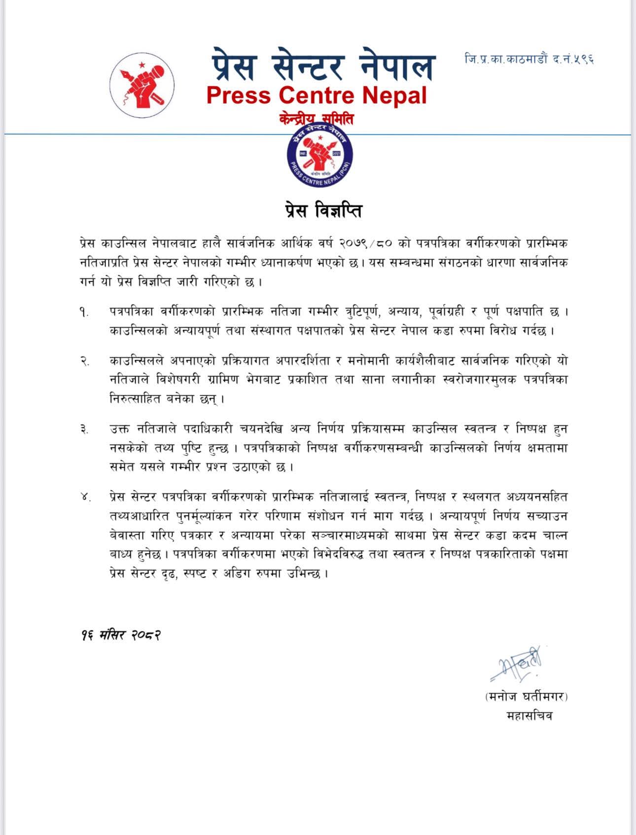 प्रेस काउन्सिलको वर्गीकरणप्रति प्रेस सेन्टर नेपालको कडा आपत्ति, पुनर्मूल्यांकनको माग