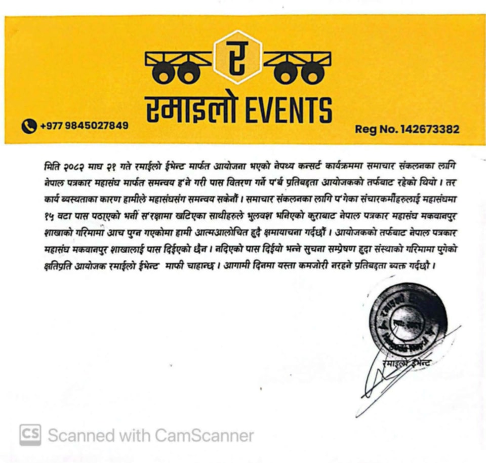जानअनजानमा गल्ती भएकोमा हामी दुःखी छौं । माफी समेत चाहन्छौं’, उनीहरुले भने । महासंघलाई पास नपठाएको र गलत हल्लाबाट महासंघ अध्यक्षसहित पत्रकारको मानमर्दन भएकोमा उनीहरुले माफी मागेका हुन् । कुनै कार्यक्रममा पत्रकारलाई बोलाउने वा नबोलाउने तथा प्रवेश दिने नदिने आयोजकको अधिकार भएको उल्लेख गर्दै महासंघ मकवानपुर अध्यक्ष अधिकारीले पत्रकारको नाम लिएर अनावश्यक र गलत हल्ला फैलाउने काम नगर्न रमाइलो इभेन्ट्ससहितका आयोजकलाई सचेत समेत गराए । कन्सर्टका आयोजकले बुधबार रिपोर्टिङका लागि पत्रकारलाई प्रवेश गर्नबाट रोक लगाएका थिए ।