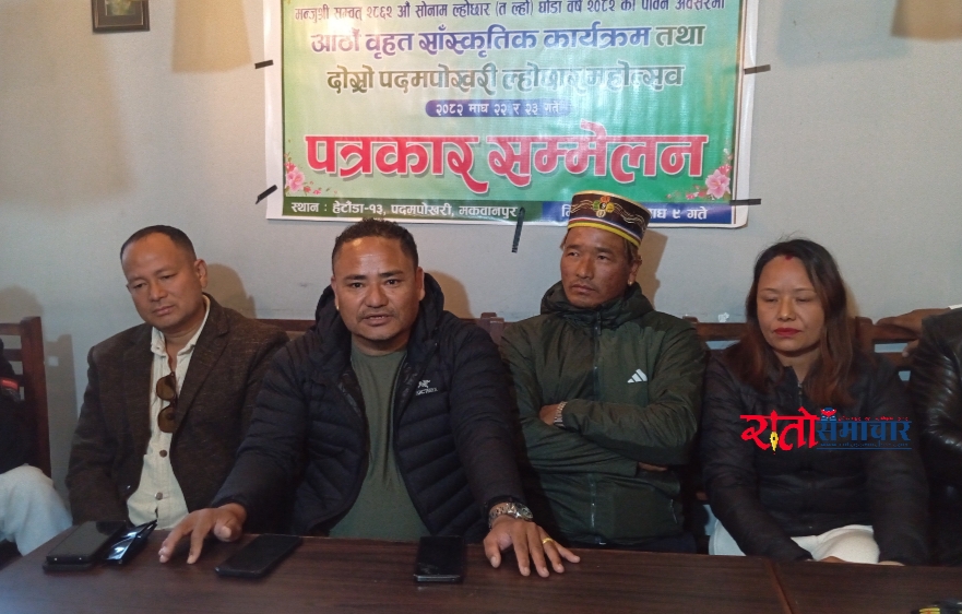 हेटौंडा । हेटौंडा–१३,मा ८ औं पटक वृह्‌त साँस्कृतिक कार्यक्रम तथा दोस्रो पदमपोखरी ल्होछार महोत्सव हुने भएको छ । यही माघ २२ र २३ गते हेटौंडा–१३,ठूलोथलीस्थित गुम्बाडाँडामा मञ्जुश्री सम्वत् २८६२ ता ल्हो (घोडा वर्ग) सोनाम ल्होछारको अवसरमा वृह्‌त साँस्कृतिक कार्यक्रमसँगै दोस्रो ल्होछार महोत्सव हुने भएको हो । शुक्रबार सोनाम ल्होछार विशेष कार्यक्रम साँस्कृति समितिका संयोजक मदन कुमार गोलले पत्रकार सम्मेलनको आयोजना गर्दै कार्यक्रमको बारेमा जानकारी गराएका छन् । पहिलो दिनको कार्यक्रमको उद्धाटन वडाध्यक्ष पेम्बा लामाले गर्नेछन् भने कार्यक्रमको समापन हेटौंडा उपमहानगरपालिकाकी नगर प्रमुख मीना कुमारी लामाले गर्नेछिन् ।