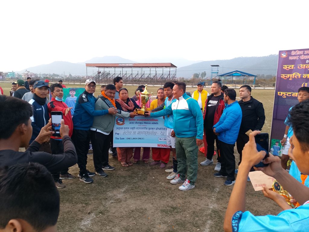 हेटौंडा उपमहानगरपालिका खेलकुद विकास समितिद्धारा हेटौंडा–५ स्थित पिप्ले–क्याम्पा रंगशालामा भएको खेल अन्तरगर्त हेटौँडा–१८ र १५ विचको फाइनल भिडन्तमा सडन डेथमा हेटौंडा–१५ ले उपाधि हात पारेको हो ।