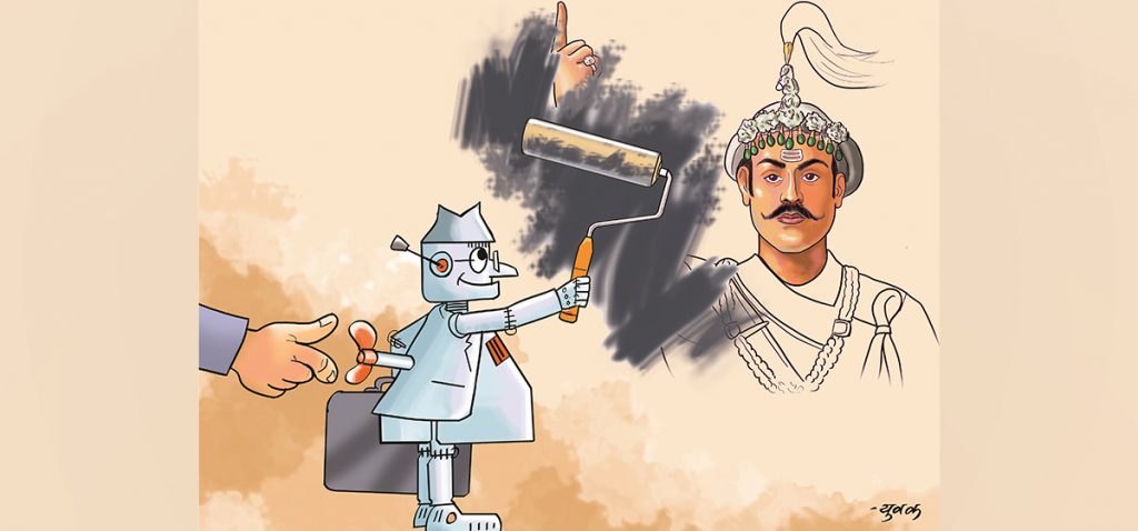 त्यसैले राजाहरूका सालिक ढालेर, इतिहासलाई रछानमा फालेर, सत्यलाई जुठेल्नुमा पुरेर उनीहरू इतिहास आफैँबाट सुरु भएको प्रचार गरिरहेका छन्। पछिल्ला पच्चीस/तीस वर्षमा राष्ट्र भत्काउने र बिगार्नेहरू सक्रिय भए। राष्ट्र सिँगार्नेहरू अपमानित भए। राजनीति प्रहसन र परिहास जस्तो बन्यो। इतिहासको उपहास भयो। यसैलाई ‘परिवर्तन’ भनियो। मुर्खहरूले ताली बजाए। लिडर बनेर आएका विदेशी कम्पनीका डिलरले मालिकले भनेअनुसार ‘मार्केटिङ’ गरे।