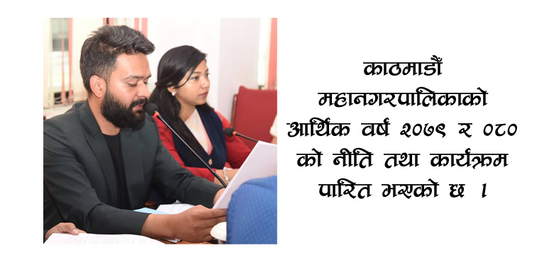 काठमाडौँ महानगरपालिकाको आर्थिक वर्ष २०७९र ०८० को नीति तथा कार्यक्रम पारित भएको छ । महानगर प्रमुख बालेन्द्र शाहले नगर अधिवेशनको पहिलो बैठकमा पेश गर्नुभएको नीति तथा कार्यक्रम आज बसेको नगरसभाले सर्र्वसम्मतरूपमा पारित गरेको हो ।