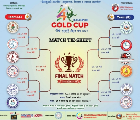बुधबार आयोजकले पत्रकार सम्मेलनको आयोजना गर्दै रतनपूरी गोल्डकप फुटबल प्रतियोगिताको खेलतालिका सार्वजानिक गरेको छ । हेटौंडा फुटबल एकेडेमीको टिमले कार्तिक ३ गते निजगढ नगरपालिकाको न्यू हिमालयन युवा क्लबको टिमसँग प्रतिस्पर्धा गर्नुपर्ने एकेडेमीका अध्यक्ष तथा प्रशिक्षक भीम लामाले जानकारी गराएका छन् । निजगढ नगरपालिका ११ नम्बर वडा कार्यालयको प्रयोजमा हुने प्रतियोगितामा हेटौंडा फुटबल एकेडेमीसहित ११ वटा टिमहरुको सहभागिता रहने छ ।