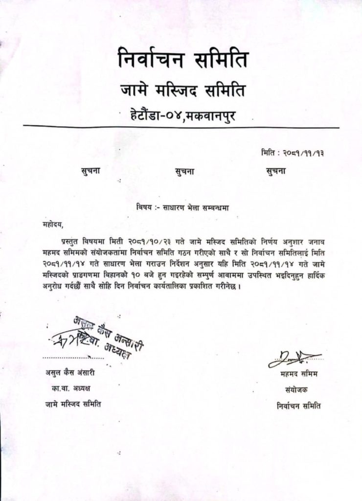 रोशन दिप – जामे मस्जिद समितिको निर्णय अनुशार महमद समिमको संयोजकत्वमा गठन गरीएको निर्वाचन समितिलाई साधारण भेला गराउन निर्देशन दिइएको छ ।