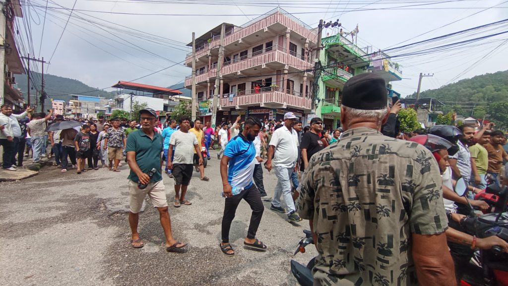 नेपाली काँग्रेस मकवानपुरको पार्टी कार्यालयमा आन्दोलन गरेपछि काँग्रेस चोकमा जम्मा भएर विरोध प्रदर्शनी गर्दै ।