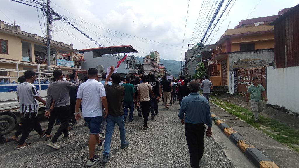सिद्धार्थ माध्यमिक विद्यालय अगाडि विरोध प्रदर्शनी गर्दै ।