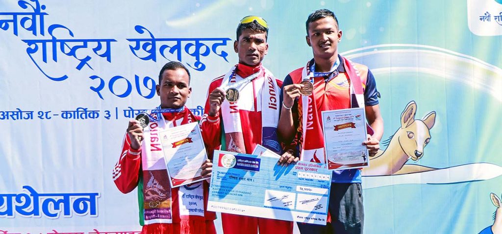 नवौं राष्ट्रिय खेलकुद प्रतियोगिता अन्तर्गत पुरुष ट्रायथोलनको स्वर्ण नेपाल आर्मीका बसन्त थारुले जितेको छन्। उनले १ घण्टा ९ मिनेट ४३ सेकेण्डमा पुरा गर्दै स्वर्ण पदक जितेका हुन्।