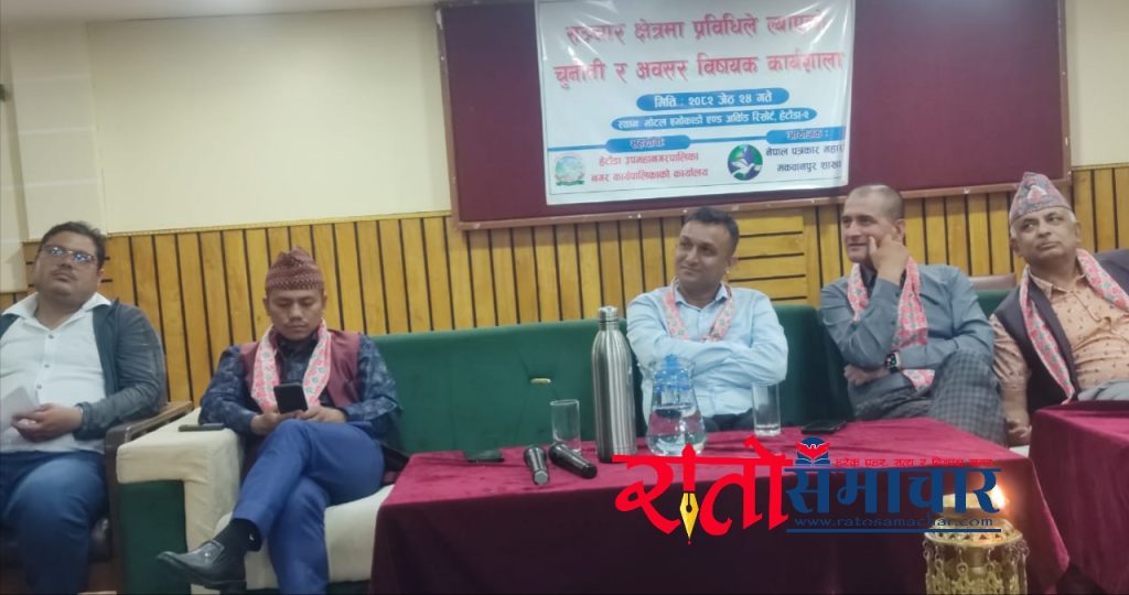 हेटौंडा । नेपाल पत्रकार महासंघका केन्द्रीय महासचिव रामप्रसाद दहालले पत्रकारको सुरक्षामाथि चुनौती रहेको बताएका छन् । पत्रकार सुरेश रजकको हत्या हुँदा कुनै प्रकारको कारबाही प्रक्रियालाई अगाडि नबढाएको केन्द्रीय महासचिव दहालले बताएका हुन् । शनिबार हेटौंडा उपमहानगरपालिकाको सहयोगमा तथा नेपाल पत्रकार महासंघ मकवानपुरको आयोजनामा सञ्चार क्षेत्रमा प्रविधिले ल्याएको चुनौती र अवसरको विषयक कार्यशालालाई सम्बोधन गर्दै उनले मृतक सुरेश रजकको हत्यामा संकलनको खोजी कार्यका लागि प्रक्रिया अगाडि नबढाएको बताए । १० महिनाको अवधीसम्म पारिश्रमिक नपाएपनि उनी आफ्नो काममा मेहनतले सक्रिय भएको जीकिर गरेका छन् ।