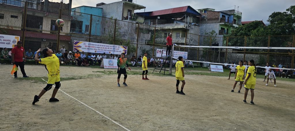 भलिबलमा बागमती विरूद्ध सर्भिस गर्दै पहेँलो जर्सीमा हेटौंडाकी महिला खेलाडी सोनिका थिङ ।