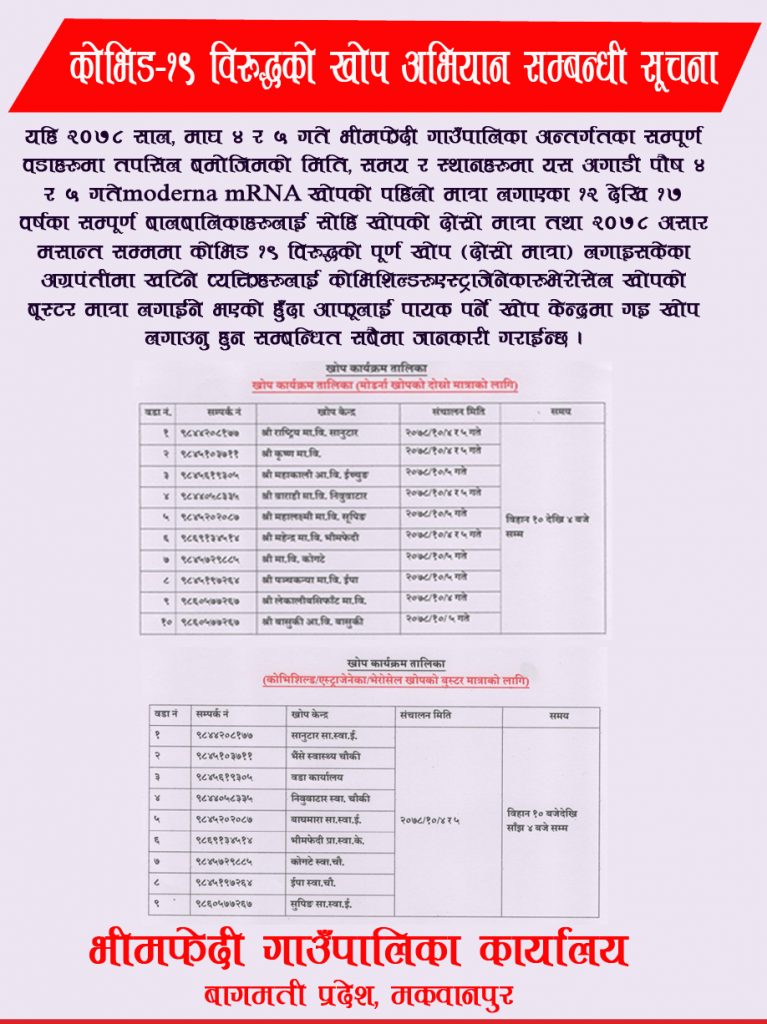 मकवानपुरको भीमफेदी गाउँपालिका अन्तर्गत कोभिड १९ विरुद्धको खोप अभियान संचालन हुने भएको छ ।