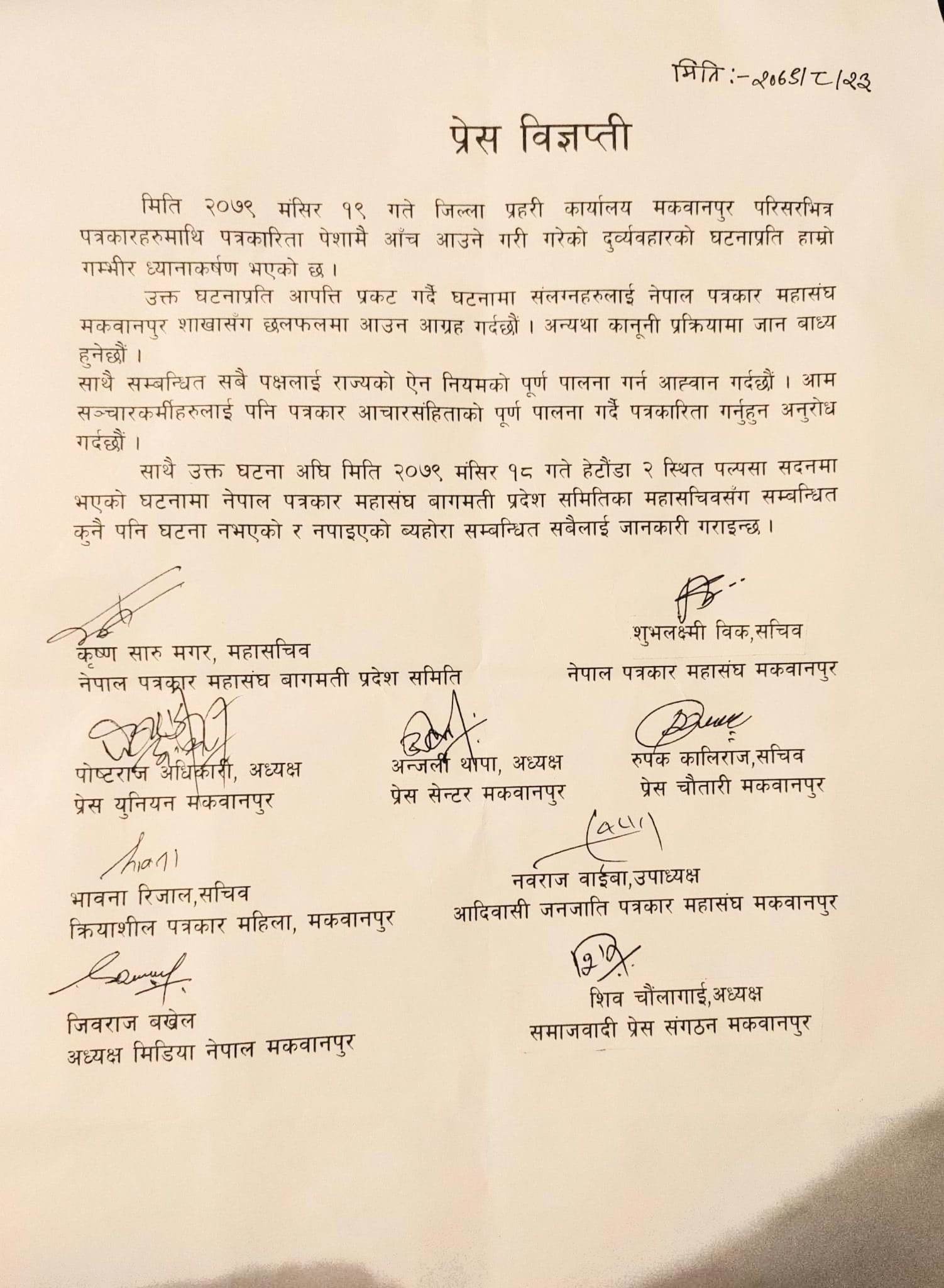 नेपाल पत्रकार महासंघ बागमती प्रदेश समिति, मकवानपुर शाखा, प्रेस युनियन मकवानपुर, प्रेस सेन्टर मकवानपुर, प्रेस चौतारी मकवानपुर, क्रियाशील पत्रकार महिला मकवानपुर, आदिवासी जनजाति पत्रकार महासंघ मकवानपुर, मिडिया नेपाल मकवानपुर, समाजवादी प्रेस संगठन मकवानपुरले संयुक्त रुपमा विज्ञप्ती जारी गरेको हो ।