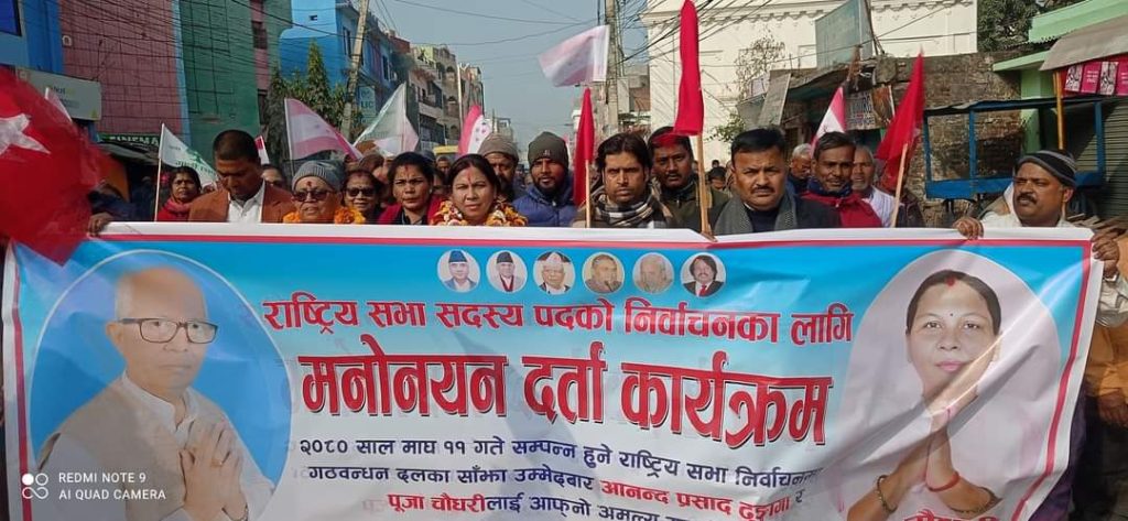 जनता समाजवादी पार्टी जसपाबाट महिला समूहतर्फ पूजा चौधरी र अन्य तर्फ बाट नेपाली कांग्रेसका केन्द्रीय सदस्य आनन्दप्रसाद ढुंगानाले मनोनयन दर्ता गराएका हुन्।